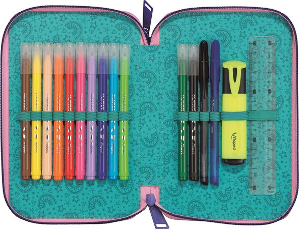 Praktikus töltött tolltartó divatos mintával, amely minden szükséges írószert tartalmaz a tanórákhoz. Két emeletes kialakításának köszönhetően a ceruzák, radírok, ollók és egyéb eszközök átláthatóan rendszerezhetők benne.